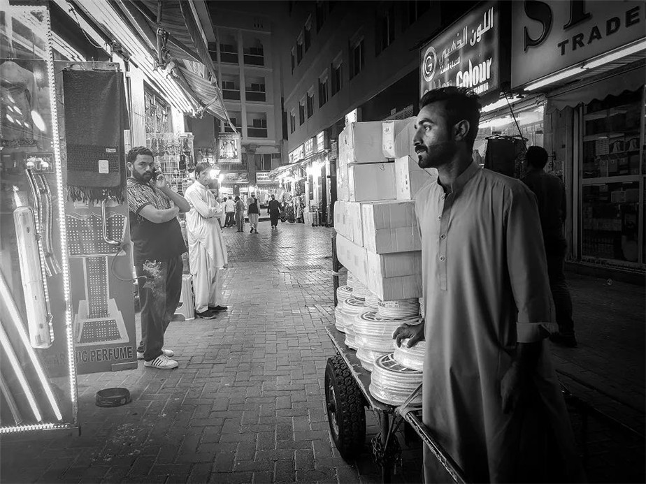 萨拉姆是一位巴基斯坦劳工,在迪拜已经六年了,25岁的他已经有了一个7个月大的孩子。他每天的工作就是游走在迪拜老市场木须巴扎(MURSHID BAZAR ),为这里的贸易商提供送货、搬运等体力服务。
