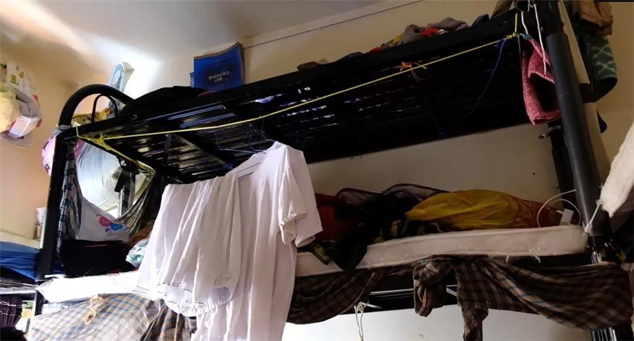 萨拉姆住在市场里一栋破旧小楼的一个小房间里,环境不尽人意。而在这样一个估计只有10几个平方米的空间里,住着12个像萨拉姆一样的劳工。因为这样一个房间每个月的费用需要3500迪拉姆,收入微薄的他们只能通过压缩这每一寸空间来平摊高昂的住宿成本。有的劳工甚至只能睡在地上。
