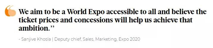 2020年世博会将提供一系列优惠,包括5岁以下儿童和65岁以上老年人免门票。6至17岁的青少年和任何年龄的学生都可以享受50%的折扣,而残疾人可以免费进入,他们的护理人员将以半价进入。此外,世博会学校计划还将为各年龄层的学生提供特别策划的旅程,以激发他们对世博会主题的兴趣。
