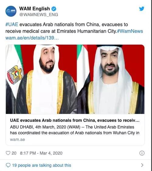 阿联酋派出了一架配备所有必要医疗设备和物资的飞机帮助人们撤离,这些人将在阿布扎比人道主义城内隔离14天。阿联酋政府将向他们提供符合世卫组织标注的医疗服务,隔离结束或者完全康复后,他们可以返回原籍国。
