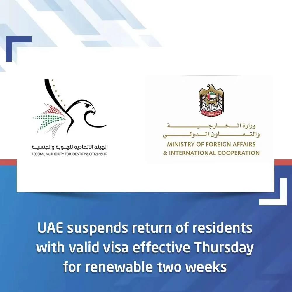 由于疫情的紧张形势,阿联酋已经禁止了目前在国外的所有阿联酋居住签证(长签)持有人入境,为期两周,自3月19日周四中午起生效。