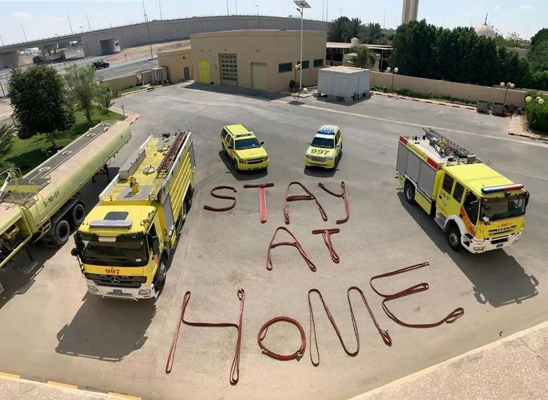 沙迦市六个主要消防局的消防员使用消防水管带在地面上编排出了“待在家里”的图案。