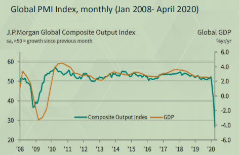 全球 PMI 综合产出指数 4 月跌至创纪录低点,商业活动和出口业务都急剧萎缩,预计疫情对世界经济的影响将大于2008-2009年的金融危机。