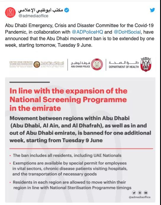 推文中表示,该禁令覆盖了阿布扎比各个地区(阿布扎比、艾因和Al Dhafrah)之间以及出入阿联酋其他酋长国。它适用于阿布扎比所有居民和国民。