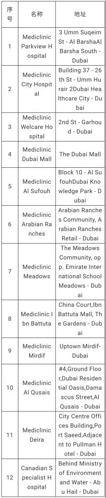 为便利自领区赴华乘客及时进行核酸检测,减少人员聚集感染风险,迪拜及北部酋长国指定的核酸检测机构除原有SEHA外,现新增Mediclinic(咨询电话:8001999)和Canadian Specialist Hospital(咨询电话:047072222)。新增检测机构信息如下: