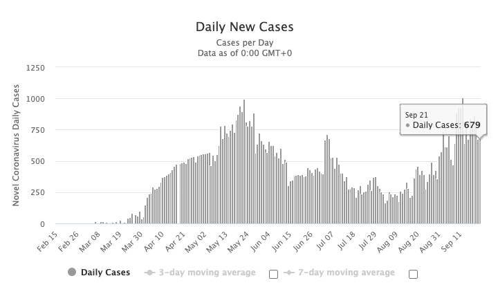周一(9.21),阿联酋卫生和预防部宣布,经过72388次新的病毒检测之后,该国单日新增679例感染病例,感染总数为85595例。