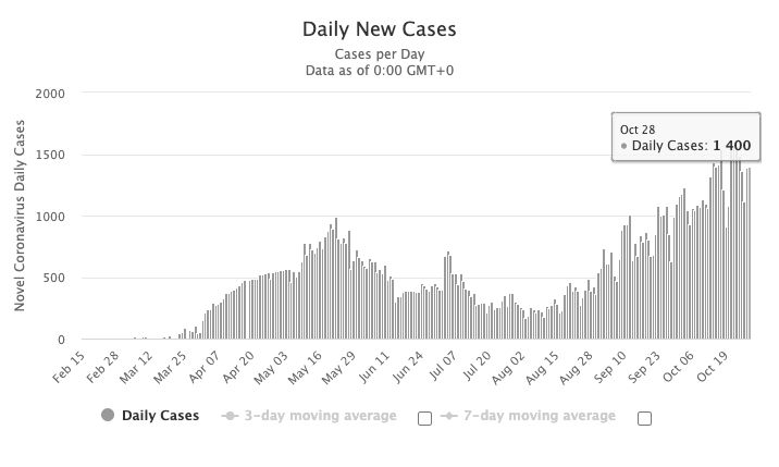 周三(10.28),阿联酋卫生和预防部宣布,在进行了104673次病毒检测之后,该国单日新增1400例感染病例,感染总数为129024例。