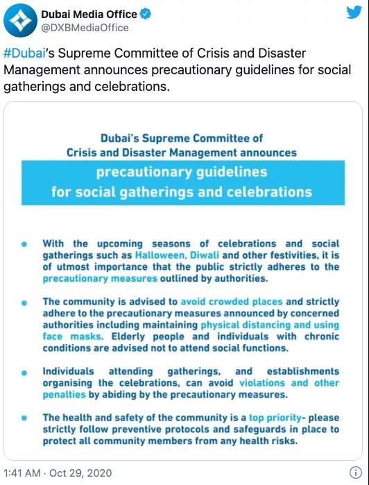 周三,迪拜危机和灾害管理最高委员会发布了社交集会的预防指南。