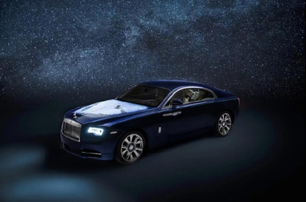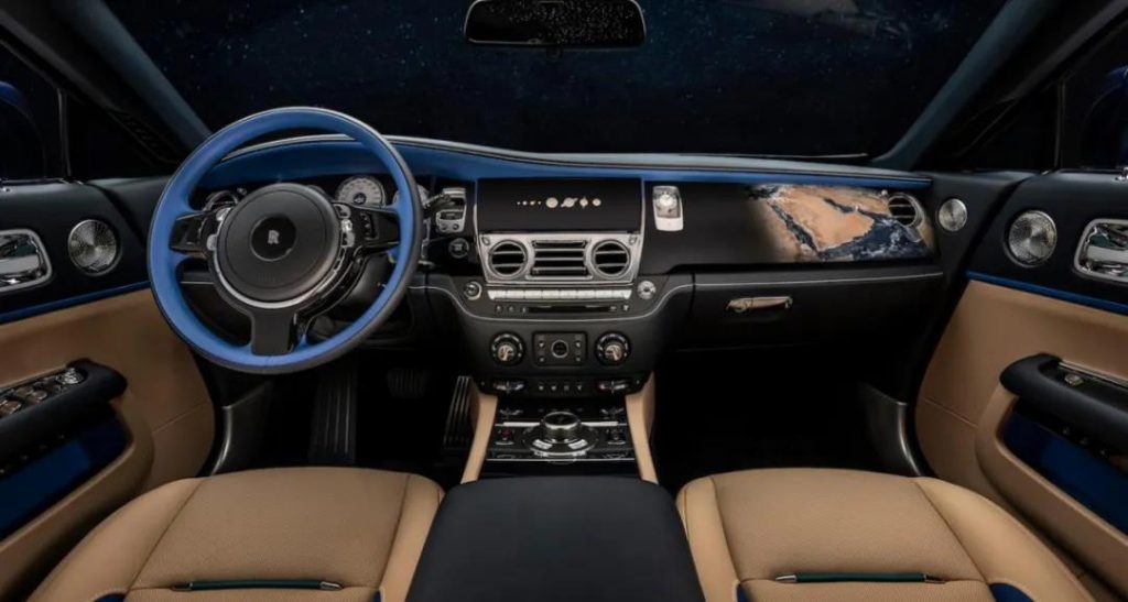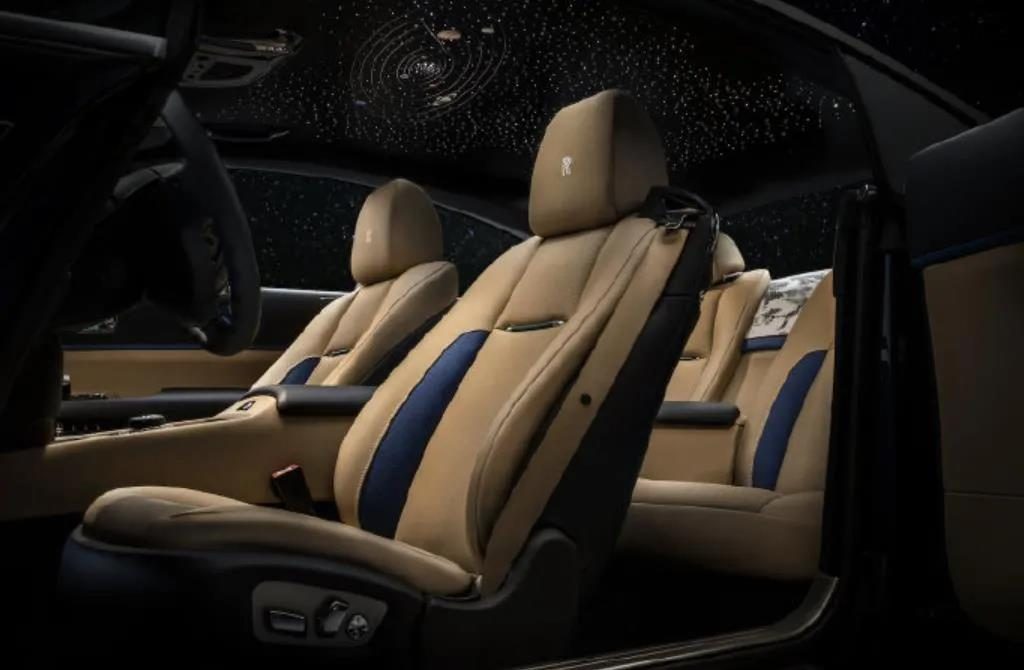 座椅就比较有意思了,特殊的莫卡辛皮革代表中东沙漠里的沙子,钴蓝色皮革代表河流,翠绿色皮革代表树木,白色的劳斯莱斯车标代表云朵,一张座椅囊括了整体环境,而劳斯莱斯特有的星空顶也改成了太阳系的模样。