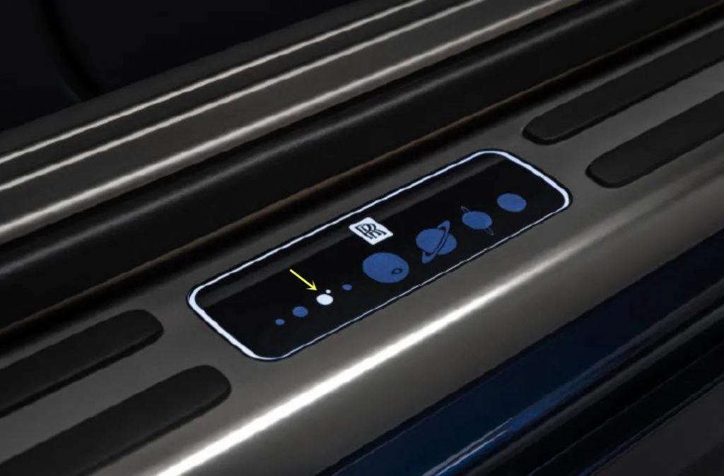 车门踏板、中控屏上可以看到一排图案,他们是太阳系八大行星,分别为水星、金星、地球、火星、木星、土星、天王星和海王星。其中地球以金色装饰,突出了他的地位。