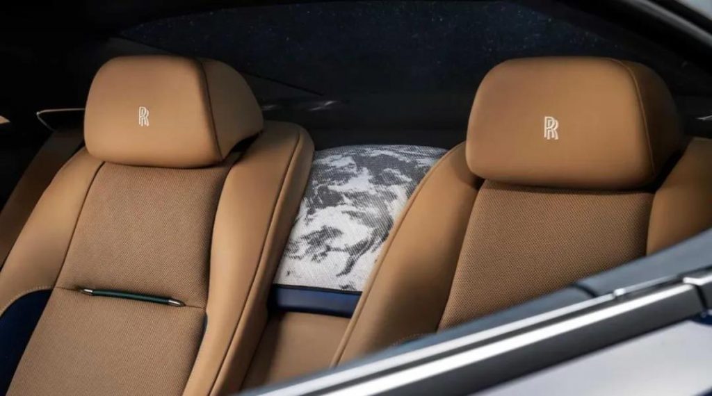 两个座椅之间还有一块装饰布,这是卫星拍出来的卫星云图,然后由劳斯莱斯的工人手工绣出云朵变化的图案。