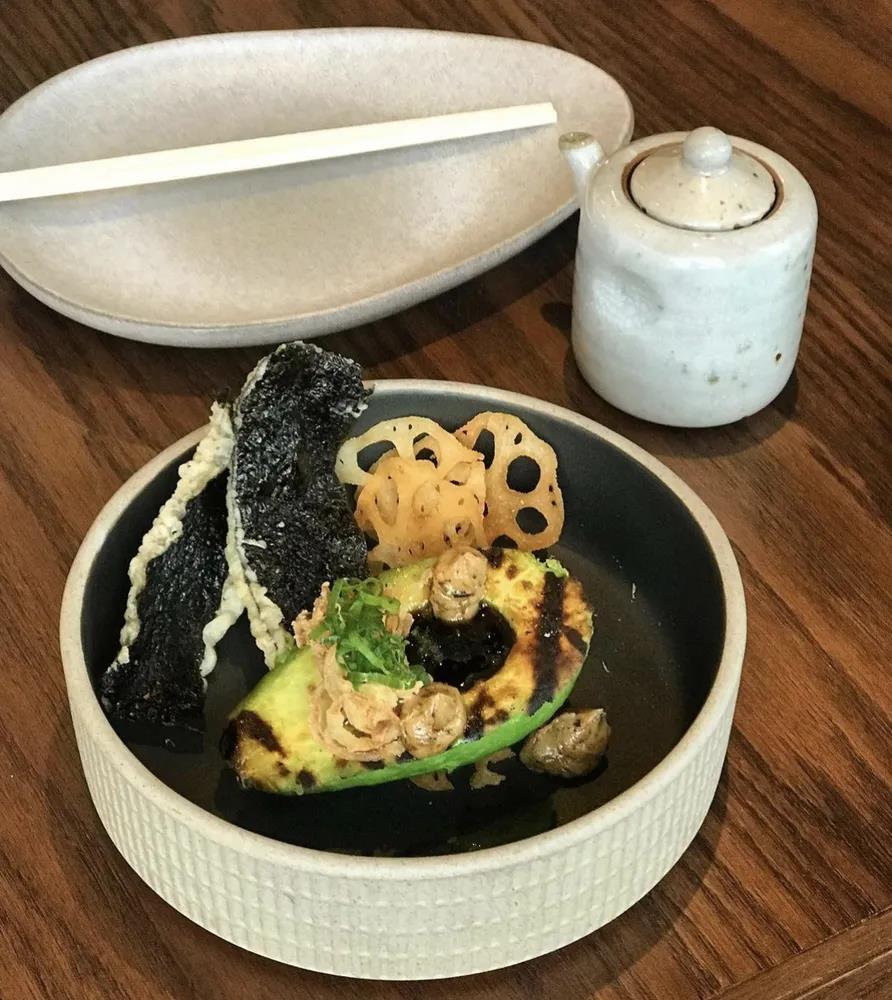 这道菜可以说极富创造力,在其他餐厅闻所未闻。万万没想到牛油果居然也可以碳烤着吃!由圆炭烤炙过的牛油果肉,配上炸好的天妇罗小菜。吃起来需要把嘎嘣脆的天妇罗拌入柔软绵密的牛油果中,这滋味~无论视觉和味觉都给人全新的体验。