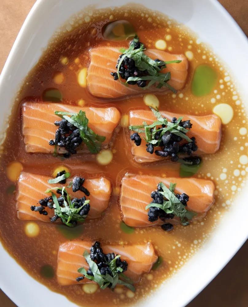 这道日式腌鱼生选用的是薄薄的三文鱼切片,配上柚子青柠酱、味噌和香脆的炭火饭,再配上紫苏叶、罗勒油和青柠酱,裹在一起塞进嘴里,众多材料的完美组合在嘴中迸发,真是鲜美无比。尤其是这个炭火饭特别的香,与餐厅的“碳烧”主题也相吻合,可谓绝妙!
