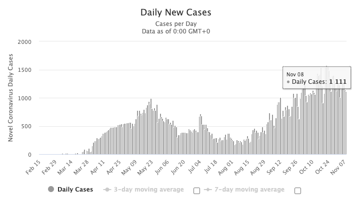 周日(11.8),阿联酋卫生和预防部宣布,在进行了154882次病毒检测之后,该国单日新增1111例感染病例,感染总数为142143例。