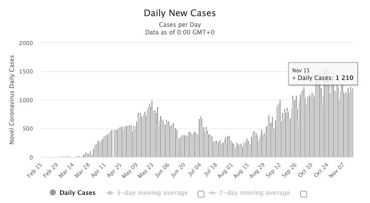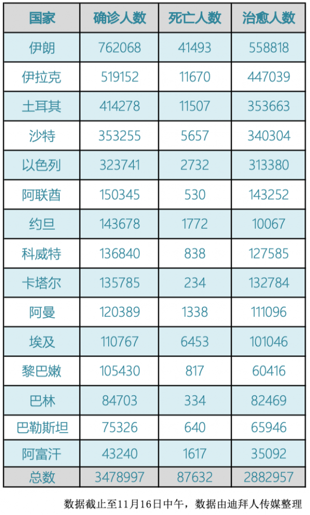 周日(11.15),阿联酋卫生和预防部宣布,在进行了126916次病毒检测之后,该国单日新增1210例感染病例,感染总数为150345例。
