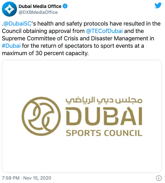 迪拜当局已经批准迪拜体育理事会(Dubai Sports Council)的提议——在遵循严格的健康和安全协议前提下,允许观众进场观看比赛,容量限制为30%。