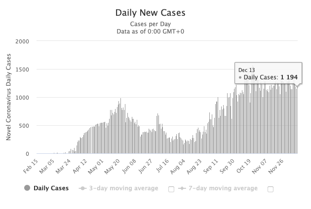 周日(12.13),阿联酋卫生和预防部宣布,在进行了143781次病毒检测之后,该国单日新增1194例感染病例,感染总数为184949例。