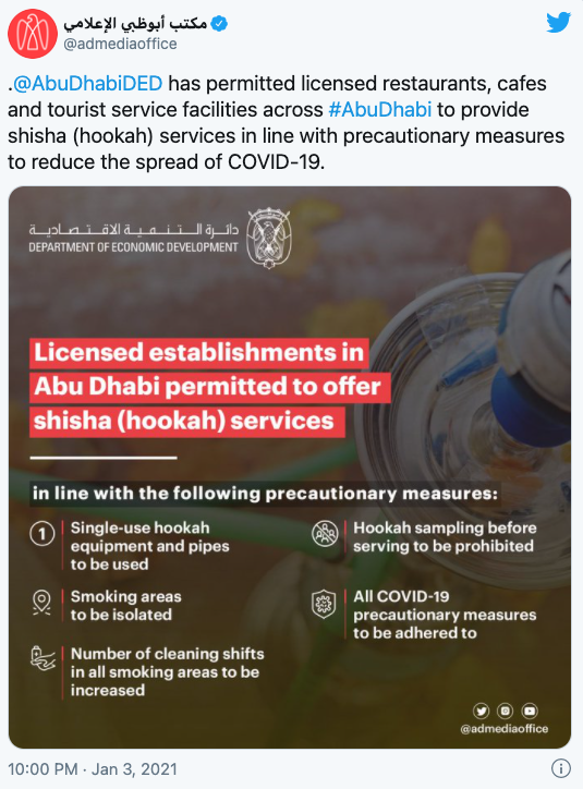 在阿布扎比经济发展部要求暂停提供水烟服务数月后,目前,该部门已允许该酋长国各地的持牌餐馆、咖啡馆和旅游服务设施重新提供水烟服务。