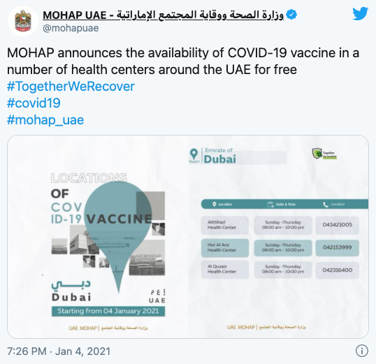 Seha在迪拜的以下2个卫生中心提供免费的中国国药集团的新冠疫苗接种服务——