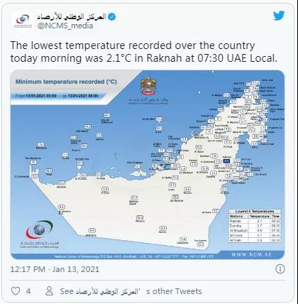 国家气象中心(NCM)表示,阿联酋目前正在经历有史以来最冷的一月份。