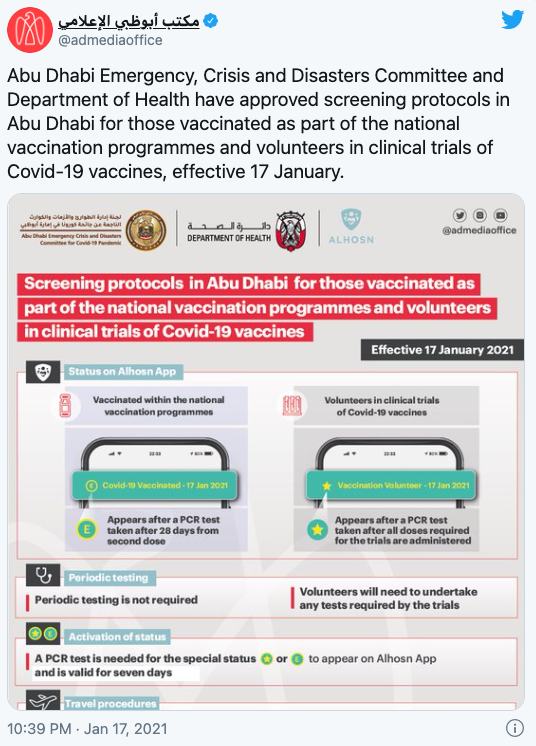 周日,阿布扎比紧急危机和灾难管理委员会更新了面向疫苗接种者的协议和豁免权;该协议同时也涵盖了对出国旅行、与阳性病例接触的隔离和相关处置程序。更新自周日起生效。