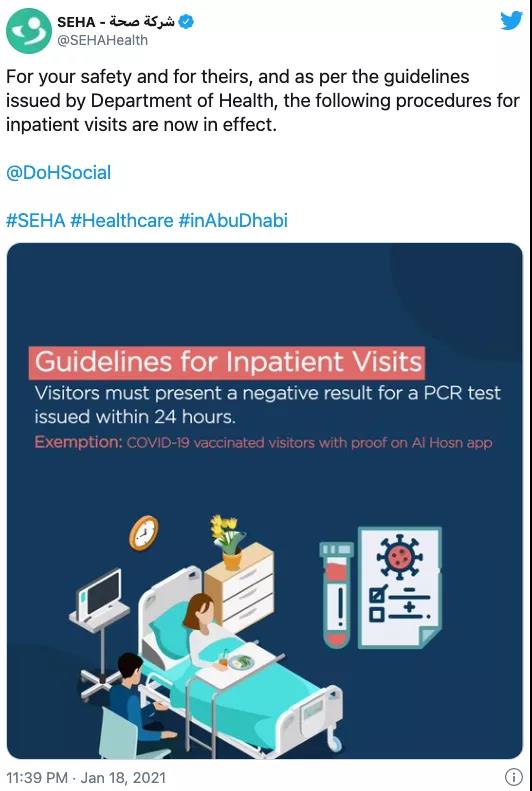 阿布扎比SEHA更新了面向住院患者(updated its guidelines for inpatient visits)的指南,患者在住院前需要进行新冠测试。