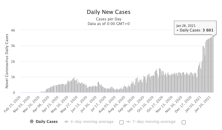 周二(1.26),阿联酋卫生和预防部宣布,在进行了175249次病毒检测之后,该国单日新增3601例感染病例——连续15日创新高——感染总数为285147例。
