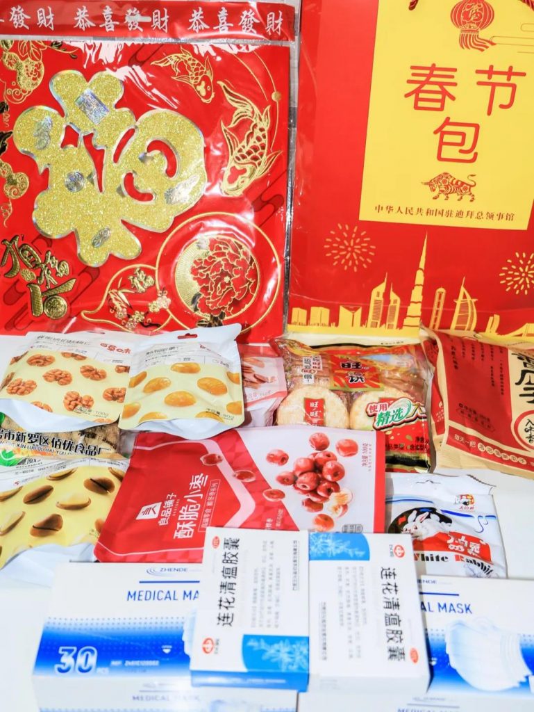 “春节包”主要包含口罩、连花清瘟,中国食物还有满满节日感的大红“福”字,面向在阿困难中国留学生、滞留中国公民、困难侨胞等。