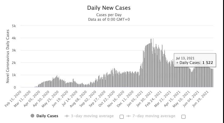 由于阿联酋继续在开展强有力的疫苗接种运动,过去10天的每日病例数一直低于 1600例。
