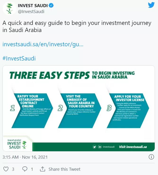 外籍投资者现在可以减少不必要的跑腿工作,在沙特开展业务只需要以下完成三个步骤。