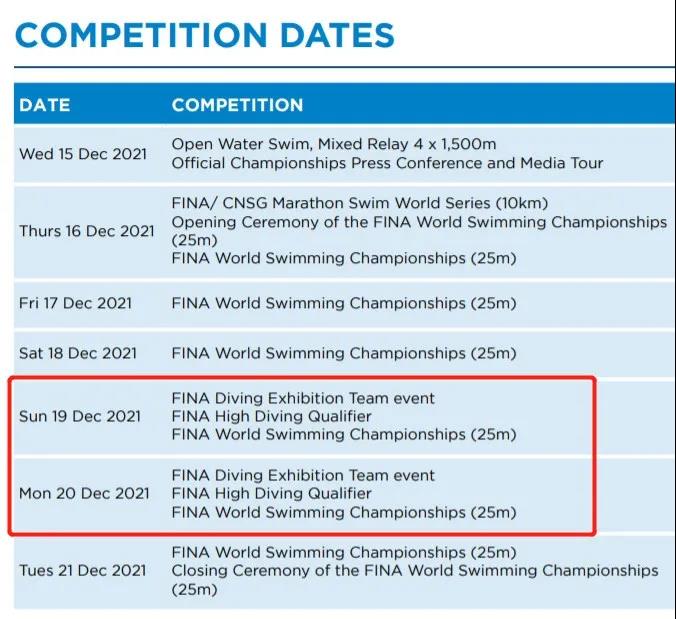 第15届国际泳联短池游泳世锦赛将于12月16日到12月21日在阿布扎比举行,届时还将举行跳水表演赛,参赛选手包含14岁小将全红婵,她曾在东京奥运会上三跳满分,上演了令全世界惊叹的“水花消失术”。
