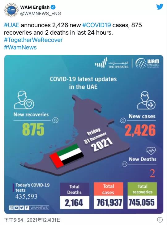 周五(12.31),阿联酋卫生和预防部宣布,该国单日新增2426例感染病例,感染总数为761937例。