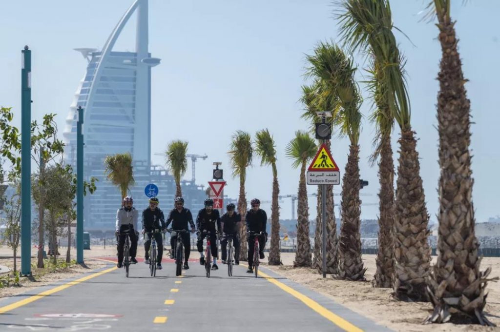 这条宽度为4米新车道从迪拜运河一直延伸到迪拜互联网城,途经许多著名景点,包括风筝海滩和帆船酒店,迪拜现在总共有520公里的自行车道供居民使用。