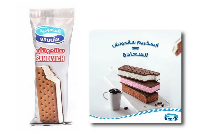Saudia是一家沙特老牌乳制品品牌,1976年就开始生产。而其中Saudia Sandwich这款夹心饼干状冰激凌是其最受沙特Local小孩喜爱的产品。外层是巧克力饼干,里面是厚厚的冰激凌夹层,拥有三种口味。这个感觉很像国内光明冰砖的地位,也是很多人从小吃到大。
