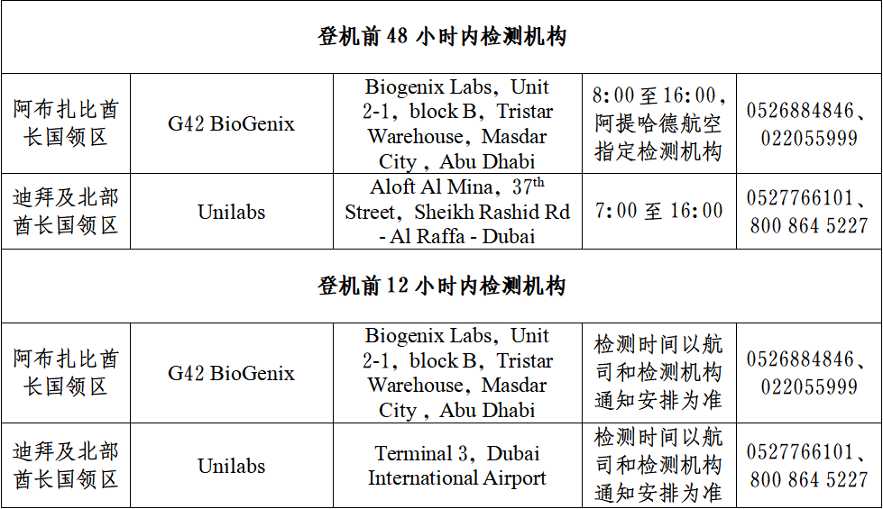 如需在登机前48小时内、登机前12小时内的以外时间进行核酸检测,亦可前往以下检测机构: