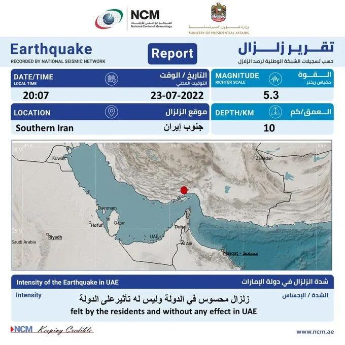 国家气象中心在推特上发文称,这场地震对阿联酋没有影响,阿联酋不同地区都出现了轻微震动现象,迪拜和沙迦包含在内。