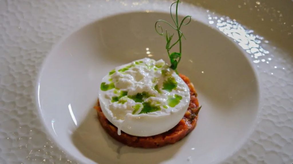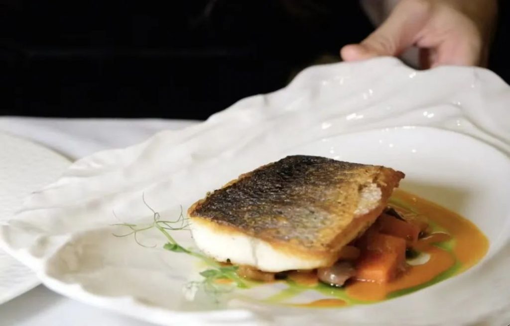 鱼皮煎的香脆,鱼肉软嫩,配烤蔬菜及Puttanes(烟花女酱),这是什么奇妙口感?其中Puttanes是用黑橄榄、刺山柑、鳀鱼、西红柿制成的,以其大胆丰富的浓烈口感而得名“烟花女酱”。其中海鲈鱼风味淡雅,肉质滑嫩,入口只有淡淡的鲜嫩滋味,正好搭配层次浓郁的酱汁,有着多重味道。
