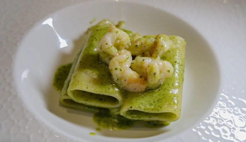 PACCHERI CON PESTODI PISTACHIO E GAMBERI