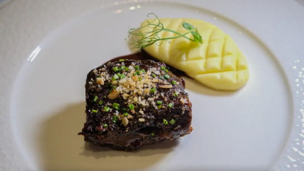 这道牛颊肉煎至焦香,各类鲜蔬加入西红柿糊,拌炒后加面粉炒香,再倒入红酒,待酒精挥发,加牛颊肉高汤,小火炖煮约12小时,可谓一道功夫菜。单吃入口虽说牛肉浓郁的香气还是表现得很好,但口感上会有些干柴,建议搭配土豆泥一起入口,会更加柔和顺滑。