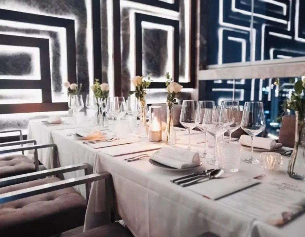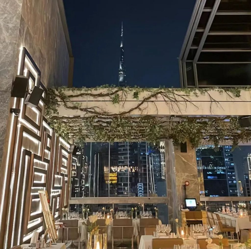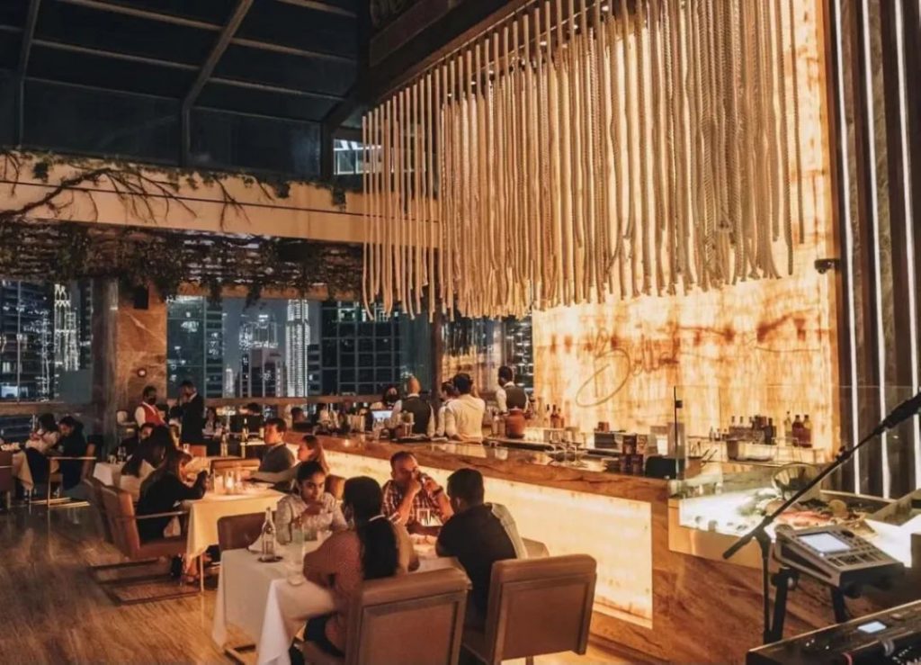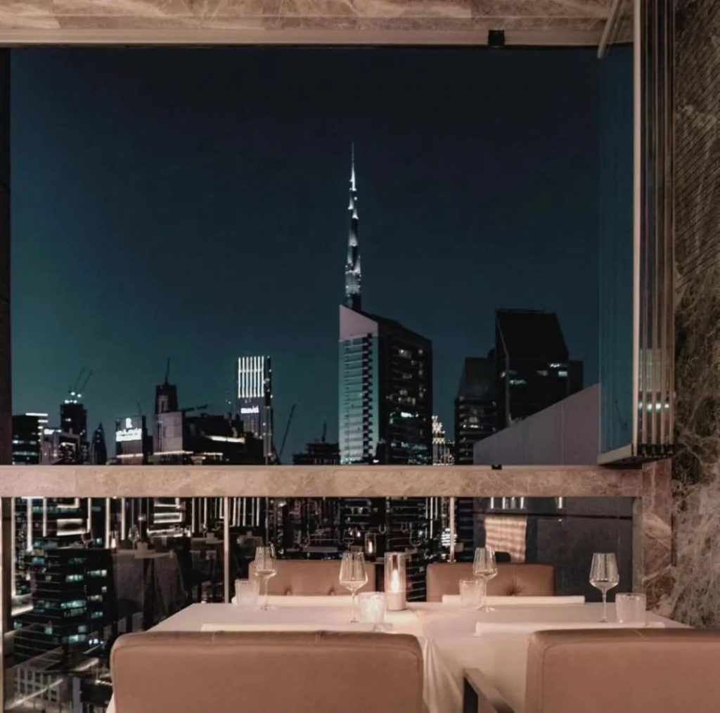 Bella位于商务港Grand Millennium酒店的顶楼,一出电梯口,服务员会询问要坐在哪个区域,这时候需要你好好思索一番。虽然是同一个餐厅酒吧,但却拥有着两种截然不同设计风格的空间。一边是拥有调酒吧台和DJ助兴的阁楼复古酒吧,一边是面朝迪拜河和哈利法塔的高级餐厅。当然你也可以在就餐结束后转移阵地,完美体验美食的乐趣和酒精的放纵。