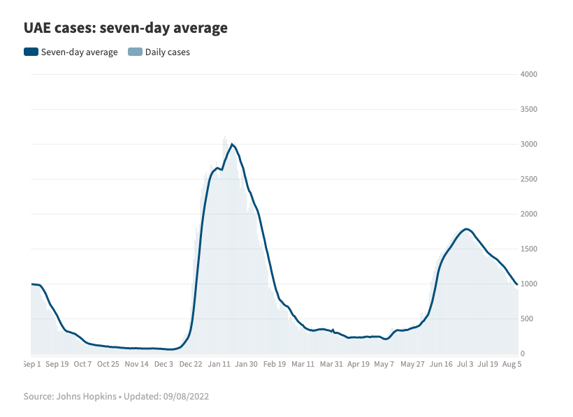 最近几周,阿联酋的每日新增呈现下降趋势。8月5日,每日新增在两个月来首次降至1000例以下,并且持续下降。