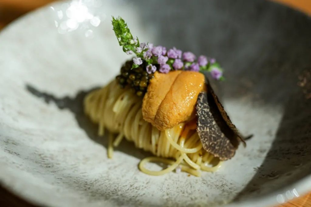这碗面其实只有一口大小,但食材用的都是最顶的。来自青森县大千海胆本就以清甜闻名,在口腔里像奶油般融化的同时得到了黑松露的提香,而意大利白鲟鱼子酱则带来咸鲜调味。加之天使意面极细而又具有韧性的口感,堪称完美之作。