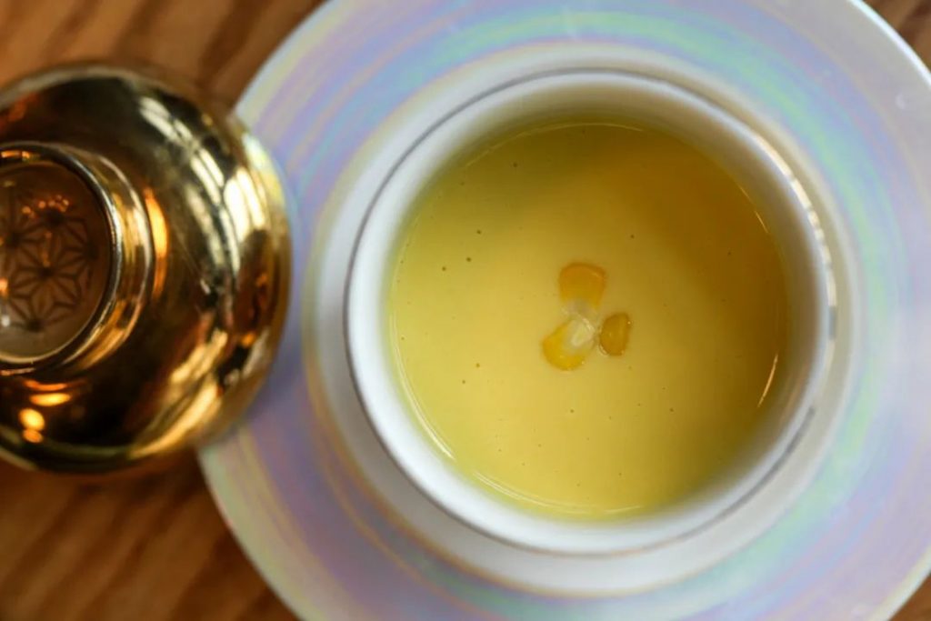 厨师富有巧思的将甜玉米打成糊加入少量奶油,盐和鸡高汤做成了果冻一样光泽温润的固体玉米浓汤。一勺下去口感凉滑的同时满口鲜甜浓郁,让人喝了还想喝。