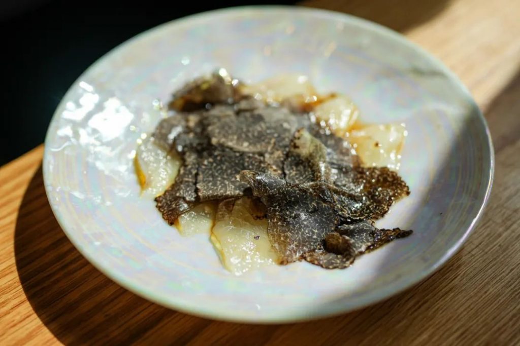 新鲜北海道赤喉保留表皮用以鹿斑切增加咀嚼度,恰当的炙烤使鱼肉清甜中又混合了炙烤的油香,这个时候只消加上一点松露盐便能充分增加层次感,炙烤和松露的香和盐粒的咸加上鱼本身的细腻甜香,层次丰富而达到微妙的平衡。