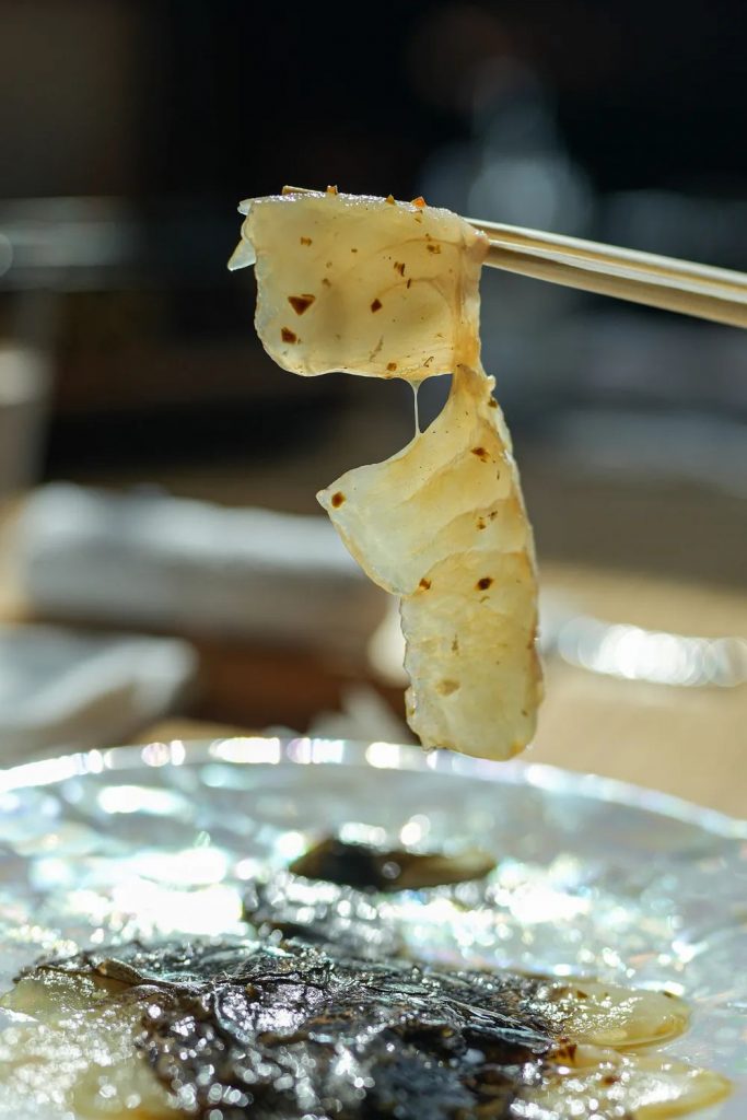 这里也可以看出Omakase有着非常高的随意性。料理方式采用的是日式火锅,这是传统的喜之次鱼食用方式,配合特别配方的日本酱油加上日本柚子甜醋,清甜的汤底味道撞击上喜之次香滑的油脂感,在清爽中强调了鱼本身的鲜甜肥美。