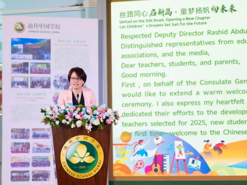 8月29日,王怡代总领事出席迪拜中国学校2025学年开学典礼。迪拜警察局、学校董事会中外方代表、领区中资企业和侨团负责人、师生和家长代表等出席。