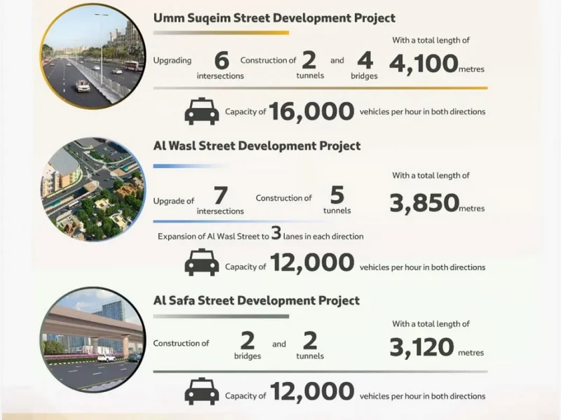 该项目将对Umm Suqeim Street、Al Wasl Road、Al Safa Street以及朱美拉街沿线的七个交叉路口进行改造,计划修建总长11公里的桥梁和隧道,同时还将进行道路拓宽工程。