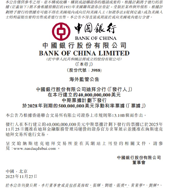 中国银行:迪拜分行发行的票据于纳斯达克迪拜交易所上市 by guocongPosted on26/11/202526/11/2025 中国银行迪拜分行在本行建立的400亿美元中期票据计划下发行、于2028年到期的5亿美元浮动利率票据,已于2025年11月25日获准在迪拜金融服务管理局运营的证券官方名单展示,并获准在纳斯达克迪拜交易所进行交易。 Read More