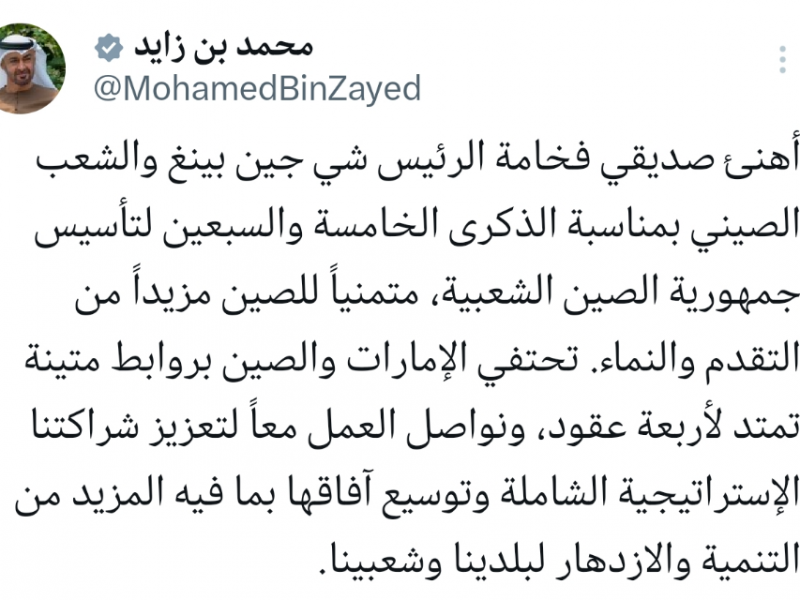 2024年10月1日,阿拉伯联合酋长国总统穆罕默德·本·扎耶德·阿勒纳哈扬、副总统兼总理穆罕默德·本·拉希德·阿勒马克图姆在社交媒体平台“X”发文祝贺中华人民共和国成立75周年。