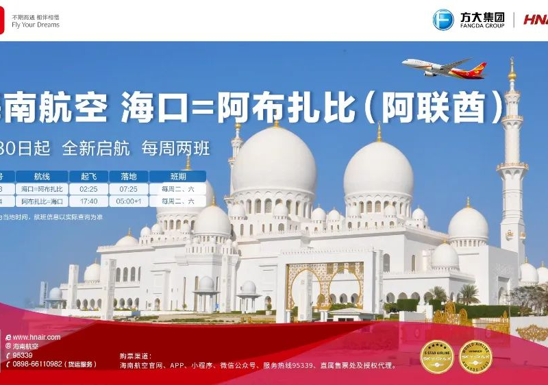 该航线由海南航空运营,每周二、周六执飞。海口前往阿布扎比的HU763航班2:30起飞,预计7:25抵达阿布扎比;阿布扎比返回海口的HU764航班17:40起飞,预计次日5:00落地海口,以上时间均为当地时间。